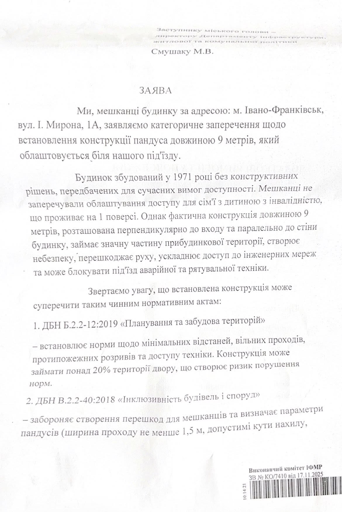 Йдеться про будинок на вул. Івана Мирона, 1а. Щоб дитина могла виходити з дому, місто замовило встановлення безпечного пандуса, який відповідає державним будівельним нормам. Однак частина мешканців будинку заблокувала виконання робіт та не допустила працівників. Про це повідомив заступник міського голови Михайло Смушак.