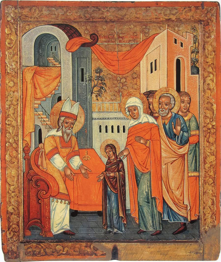 За Переданням, Йоаким і Анна довго не мали дітей і дали обітницю: якщо Господь дарує їм дитину, вони присвятять її на служіння Богові. Коли народилася Марія, батьки виконали свою обіцянку – і у три роки відвели її до храму. У супроводі дівчат із запаленими світильниками Марія ввійшла до святині.