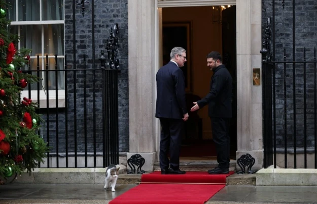 Потім Зеленський помахав рукою коту Ларрі, який сидів біля дверей, а потім разом зі Стармером вони зайшли у резиденцію.