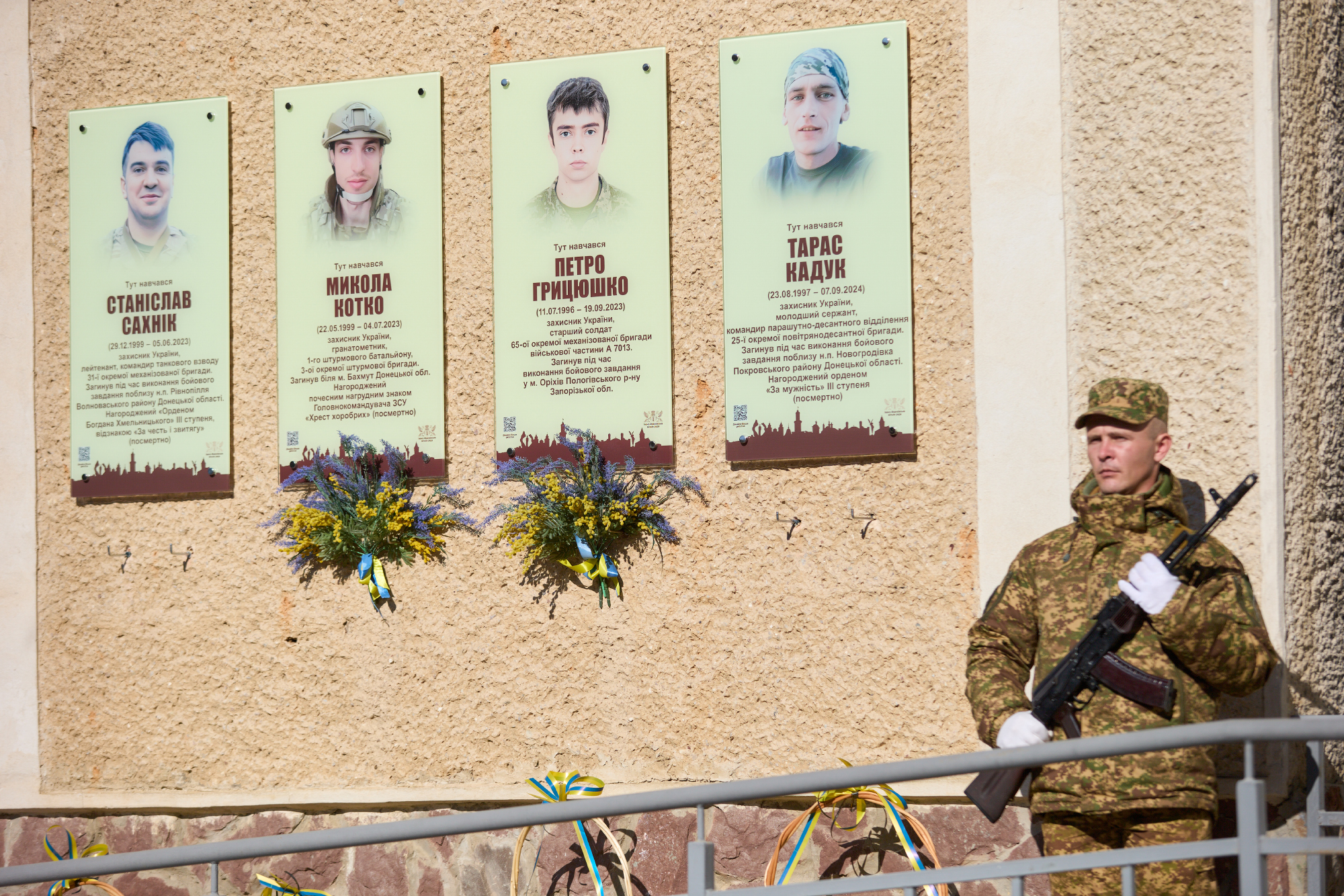 На фасаді ліцею №21 ім. Євгена Коновальця встановили анотаційні дошки Станіславу Сахніку та Тарасу Кадуку — випускникам навчального закладу, які віддали життя, захищаючи незалежність України.