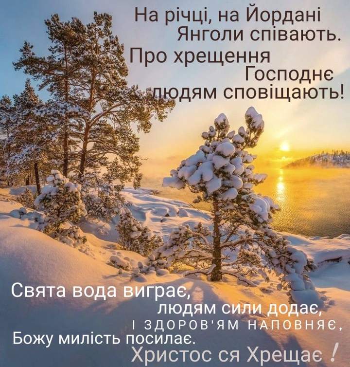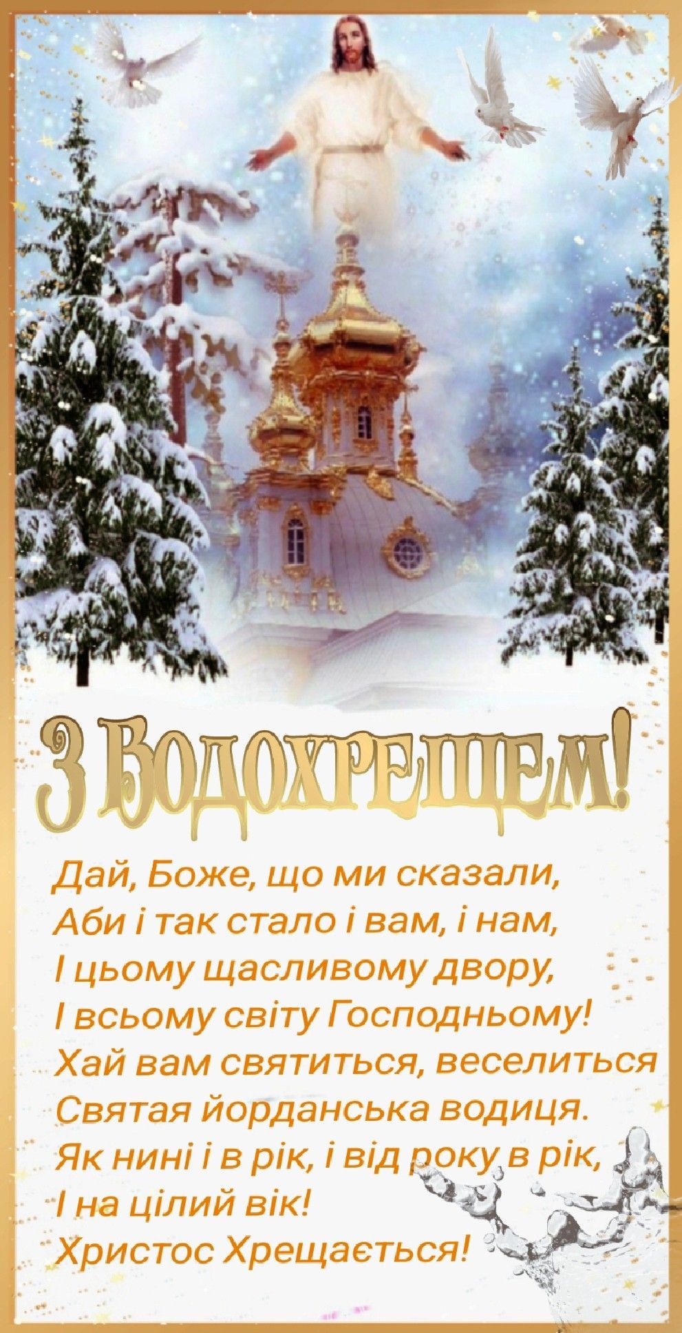 Зі святом Хрещення Господнього! Нехай свята вода стане джерелом радості й оновлення, хай подарує тобі й твоїй родині міцне здоров’я, душевний спокій і віру в краще. Хай у цей день ангели торкнуться твоєї душі, наповнять її світлом і добром, а всі дороги життя ведуть до щастя й здійснення мрій.