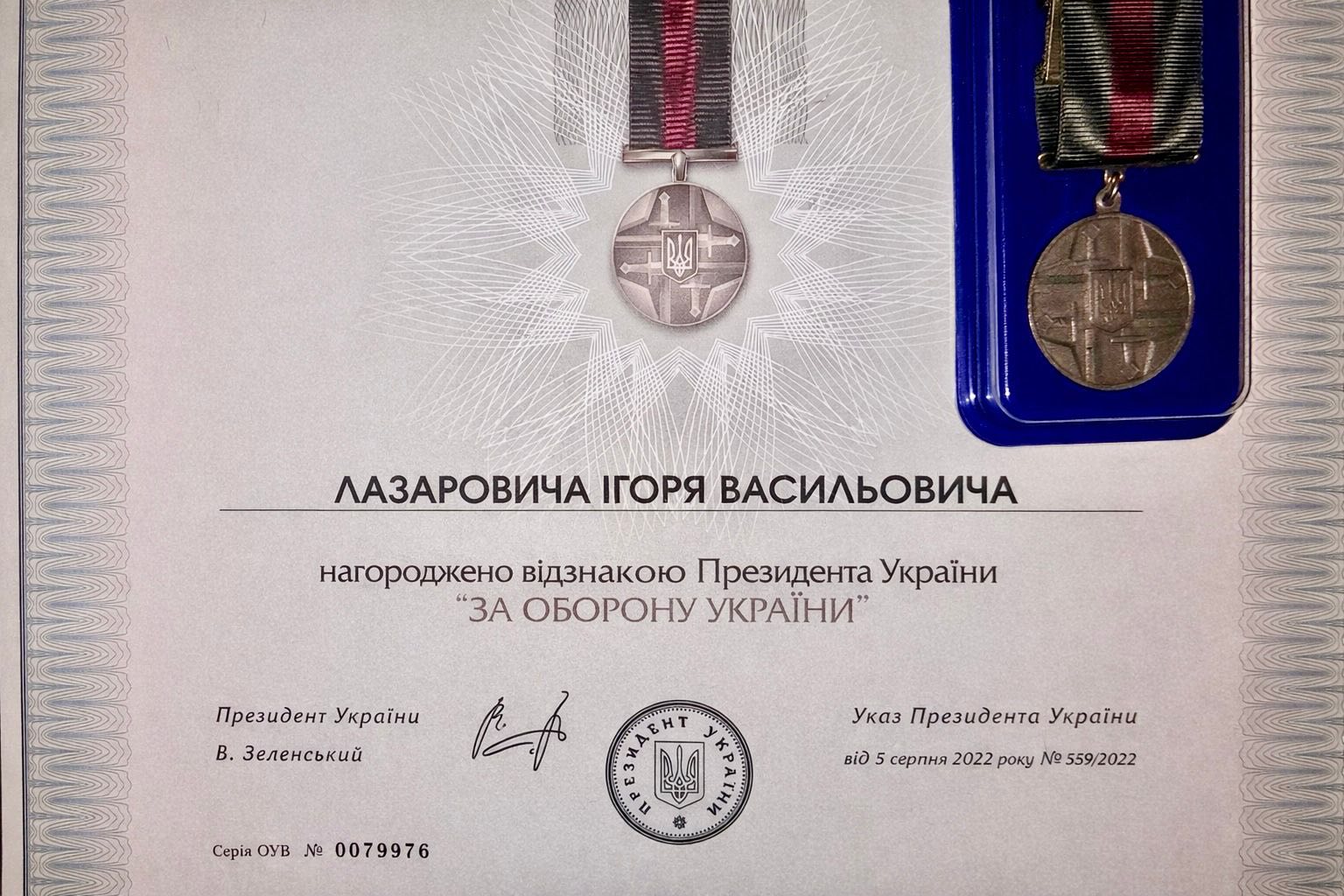 За безпосередню участь у захисті держави під час повномасштабної агресії російської федерації Ігор Лазарович відзначений відзнакою Президента України «За оборону України» (Указ від 5 серпня 2022 року №599/2022).