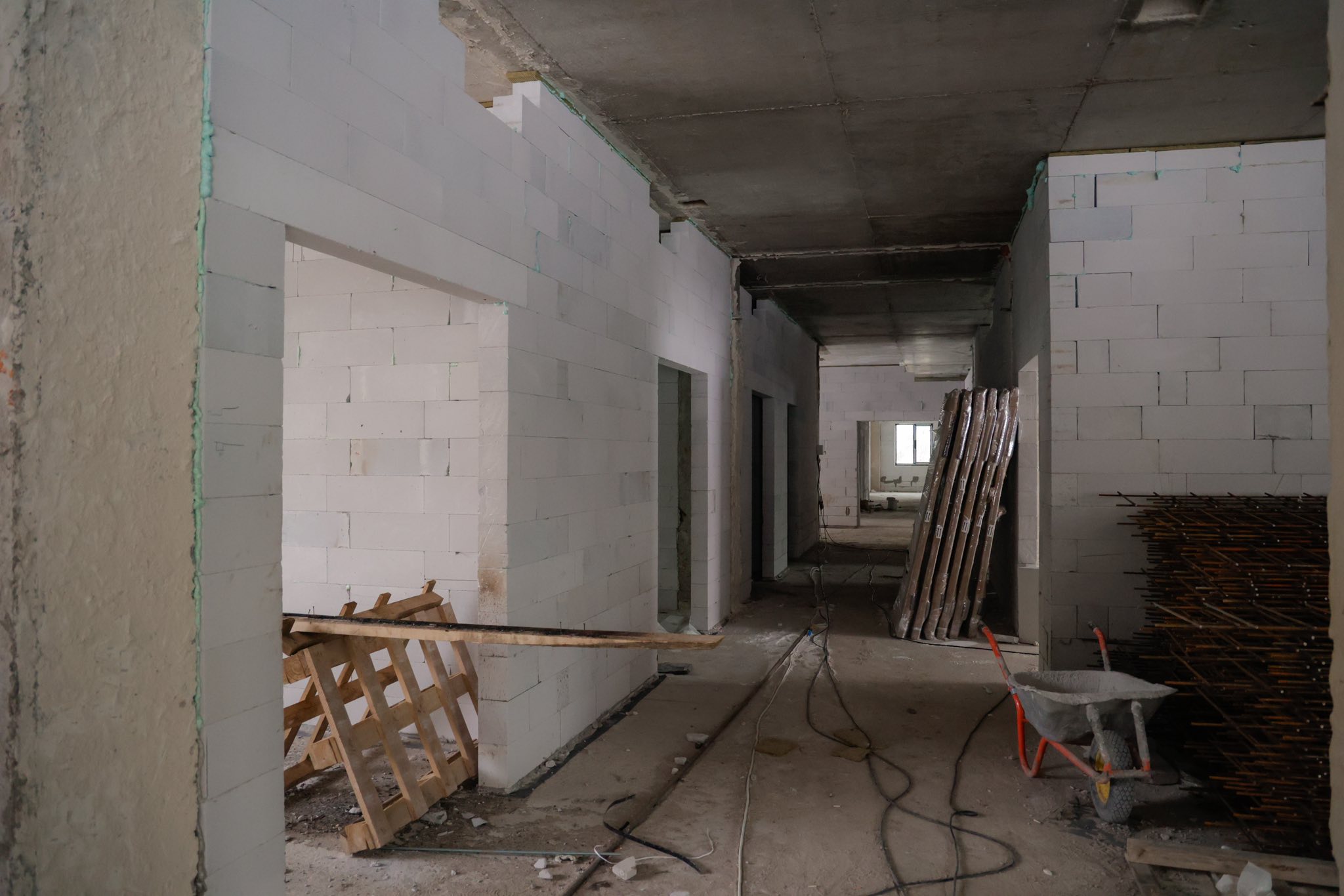 Наразі роботи зосереджено в основному корпусі, де функціонуватиме стаціонарне відділення. Уже завершено основні конструктивні роботи, змонтовано покрівлю, встановлено вікна. Триває прокладання інженерних мереж і вентиляції та підготовка приміщень до внутрішнього оздоблення. Паралельно будується захисна споруда цивільного захисту з паркінгом.