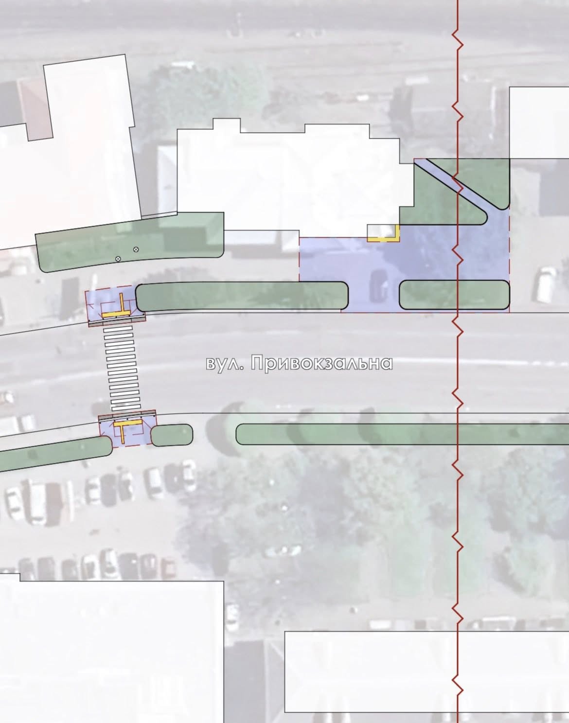 встановити пішохідний світлофор на переході навпроти центрального входу до залізничного вокзалу для безпечного та контрольованого руху пішоходів;