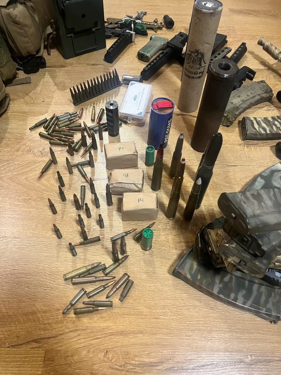 Під час санкціонованих обшуків за місцями проживання фігурантів справи вилучено набої та комплектуючі до вогнепальної зброї, димові гранати, ноутбуки, мобільні телефони, грошові кошти, чорнові записи та інші речові докази.