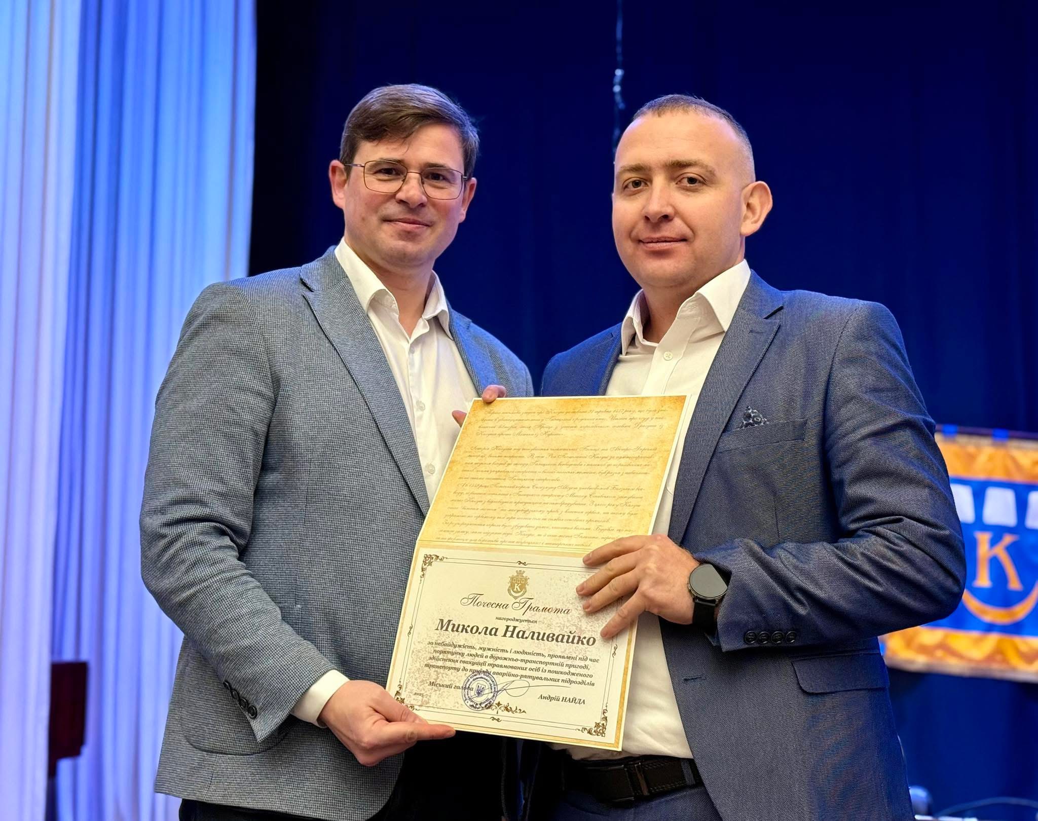 Голова Калуської громади Андрій Найда вручив Почесну грамоту Миколі Наливайку за проявлену мужність, небайдужість та врятовані людські життя.