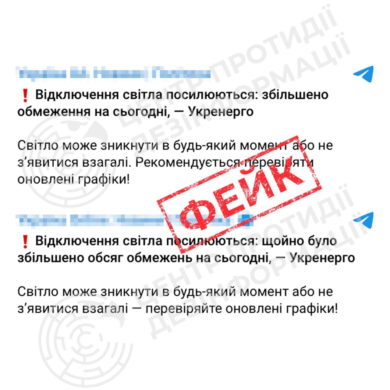 За інормацією Центру протидії дезінформації у Telegram-каналах поширюється фейкова заява «Укренерго» про посилення відключень електроенергії сьогодні.