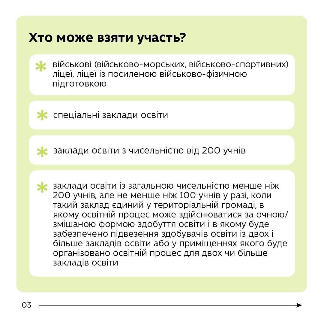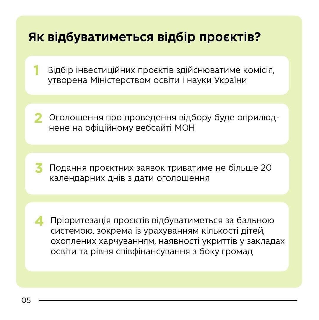 Відбір проводитиме спеціальна комісія при Міністерстві за бальною системою з урахуванням кількості учнів у школі, наявності укриття та рівня співфінансування місцевим бюджетом.