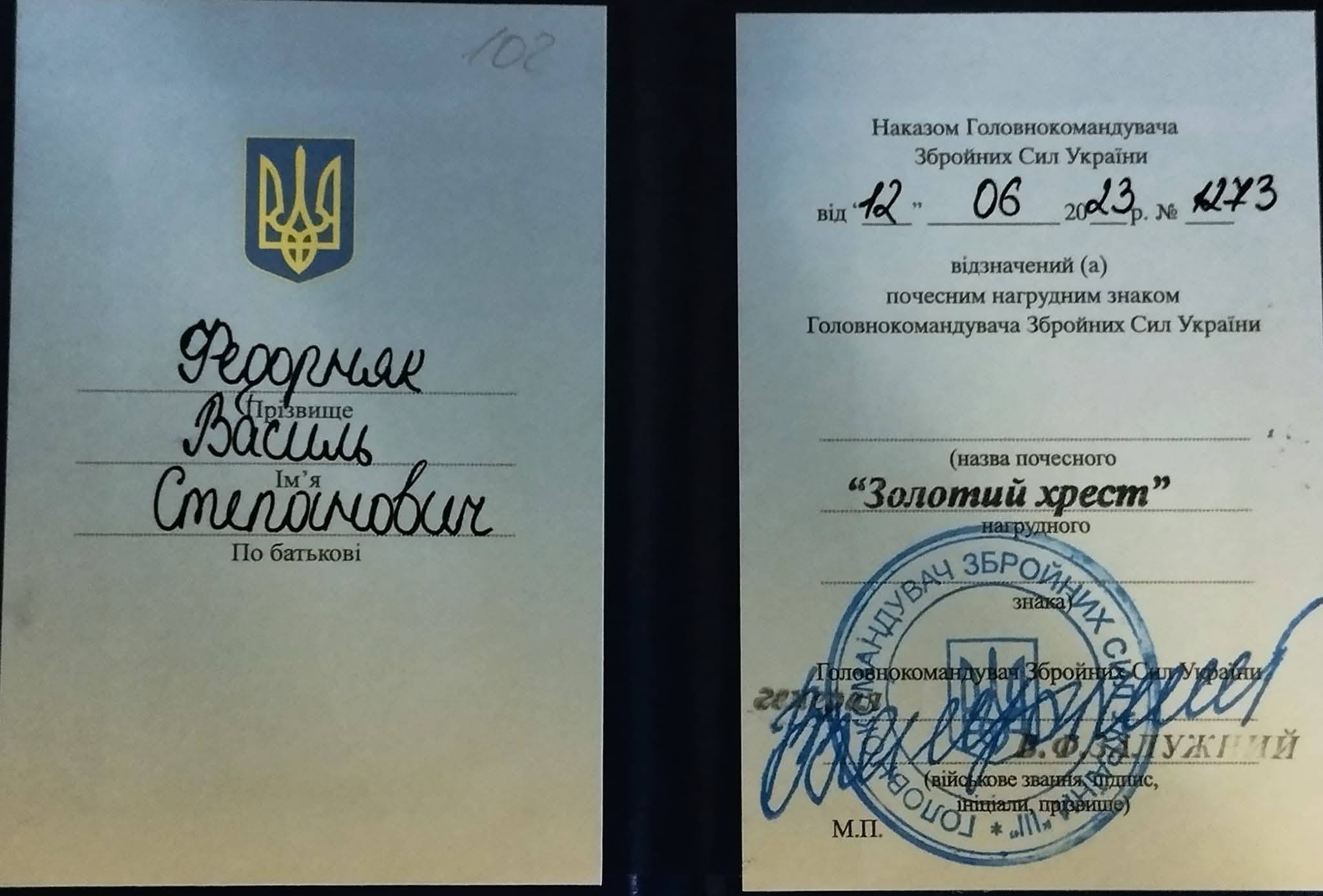 У 2023 році Василь Федорняк був нагороджений почесною відзнакою – «Золотим хрестом» тодішнього Головнокомандувача ЗСУ Валерія Залужного. Нагороду вручають за проявлену мужність та успішне виконання бойових завдань.
