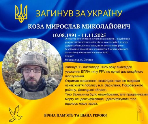У Покровському районі Донецької області загинув прикарпатець Мирослав Коза, який проходив службу оператором безпілотних літальних апаратів.