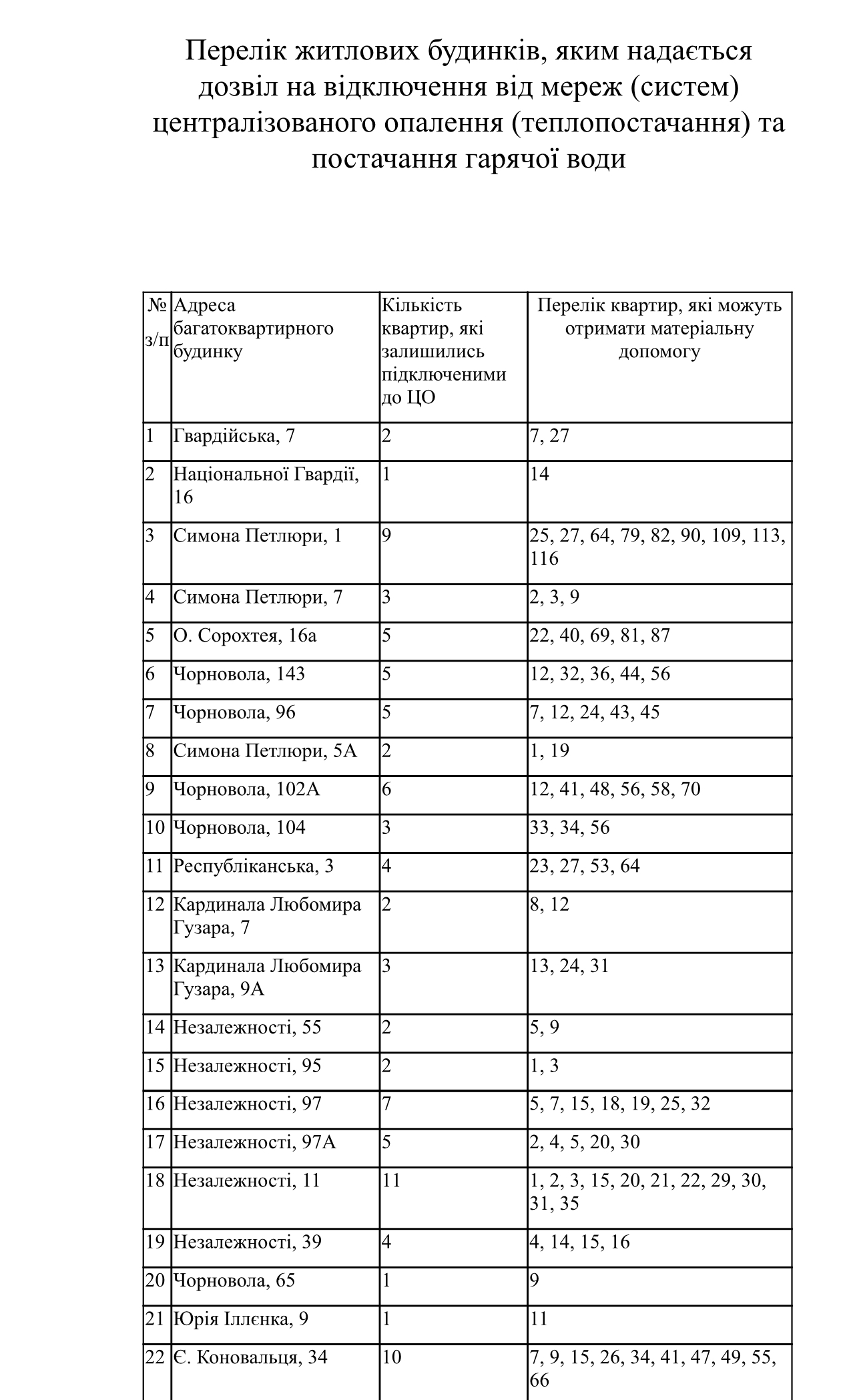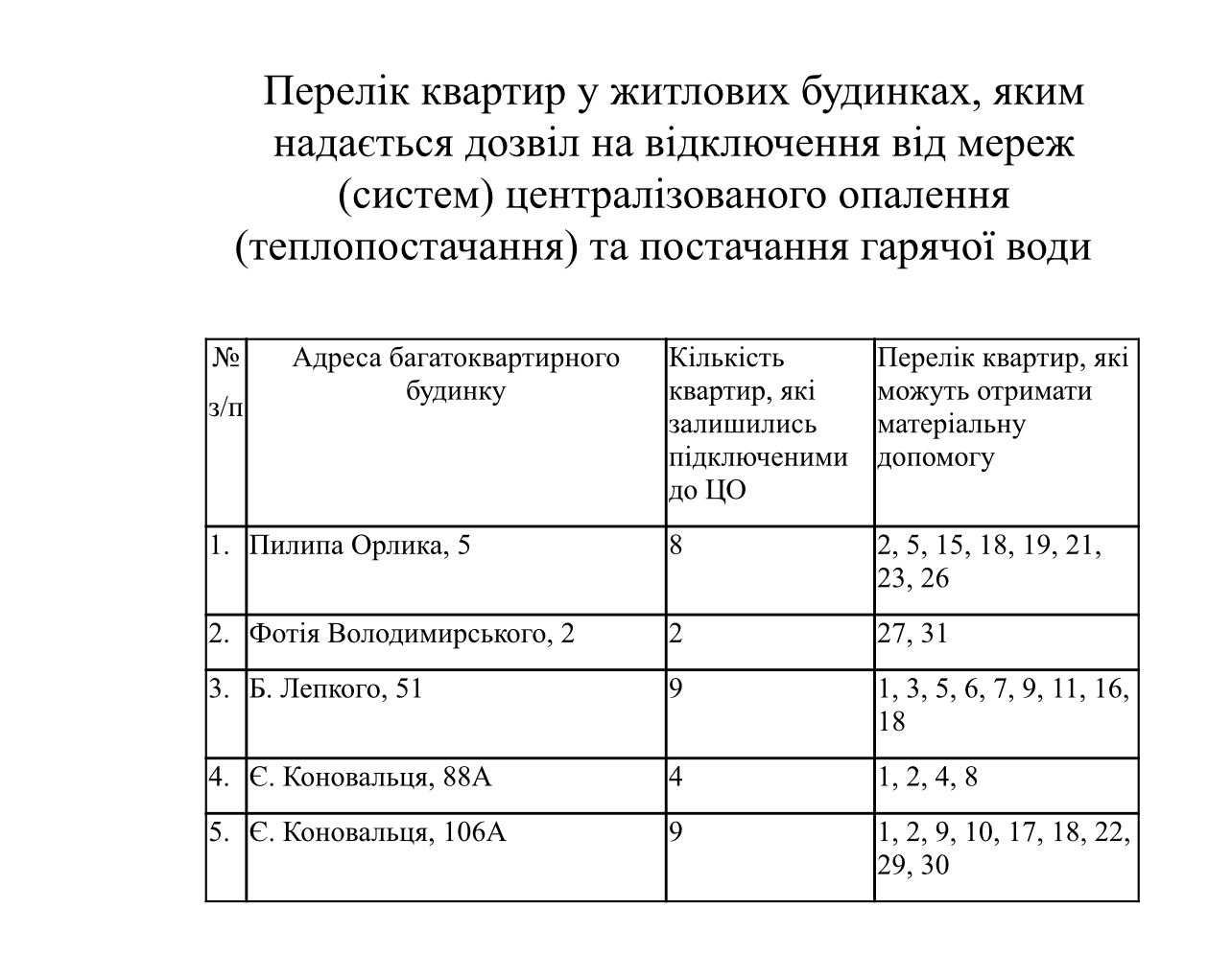 - надали дозвіл на повне відключення окремих житлових будинків від централізованого опалення з подальшим встановленням індивідуальних систем;
