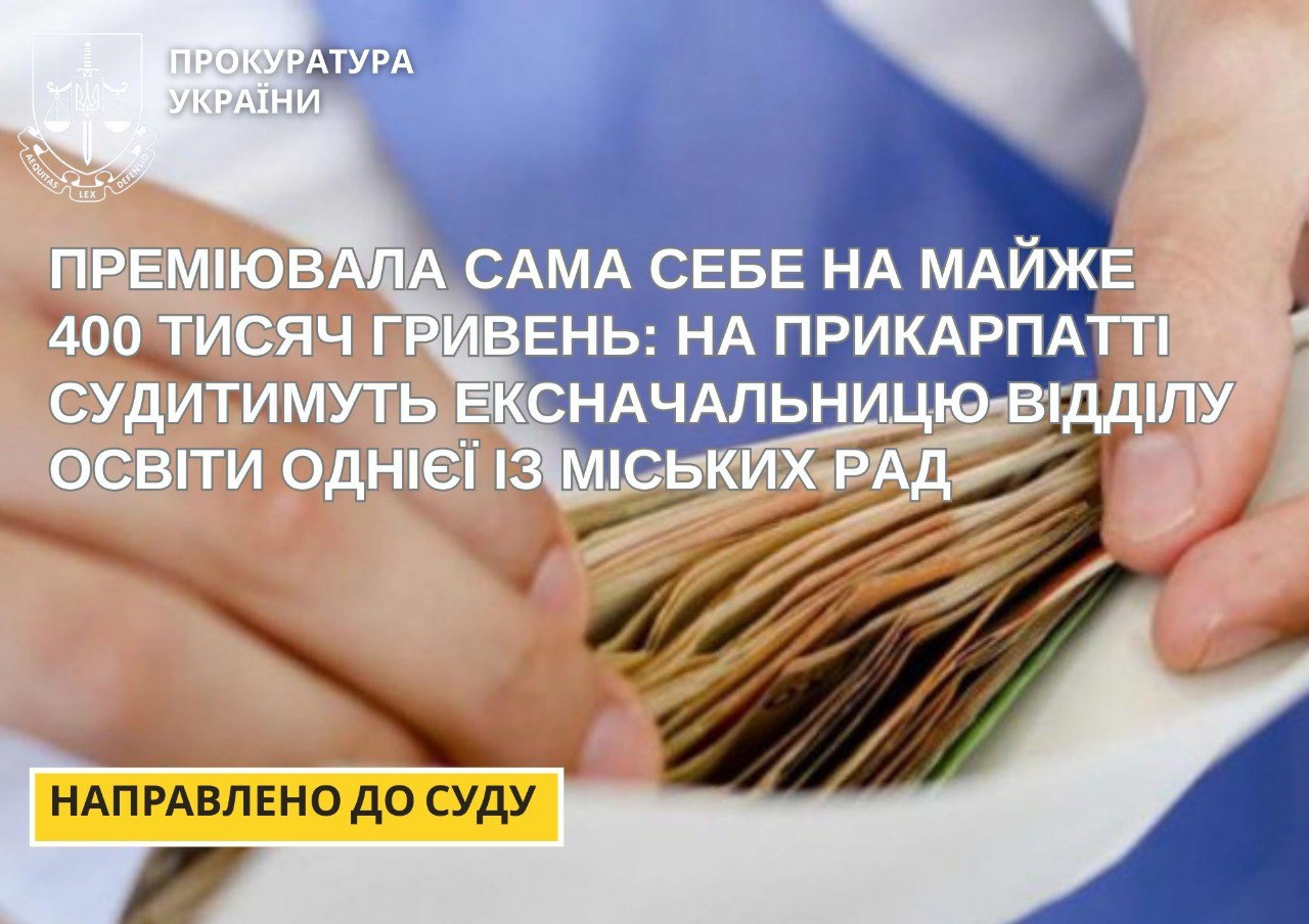 48-річна жителька Прикарпаття, яка перебувала на посаді начальниці відділу освіти, видавала накази про преміювання самої себе всупереч вимогам законодавства.