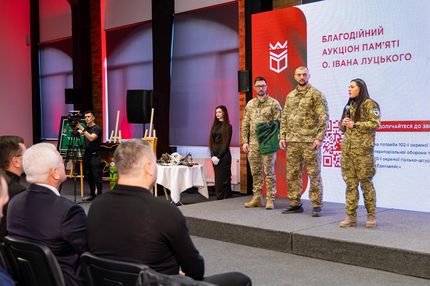 На аукціоні представили дванадцять попередньо анонсованих лотів і два ексклюзивні – глиняну мініатюру отця Івана Луцького від франківського скульптура-мультиплікатора Богдана Савлюка та коїн від старшого сержанта 102 ОБр ТрО.