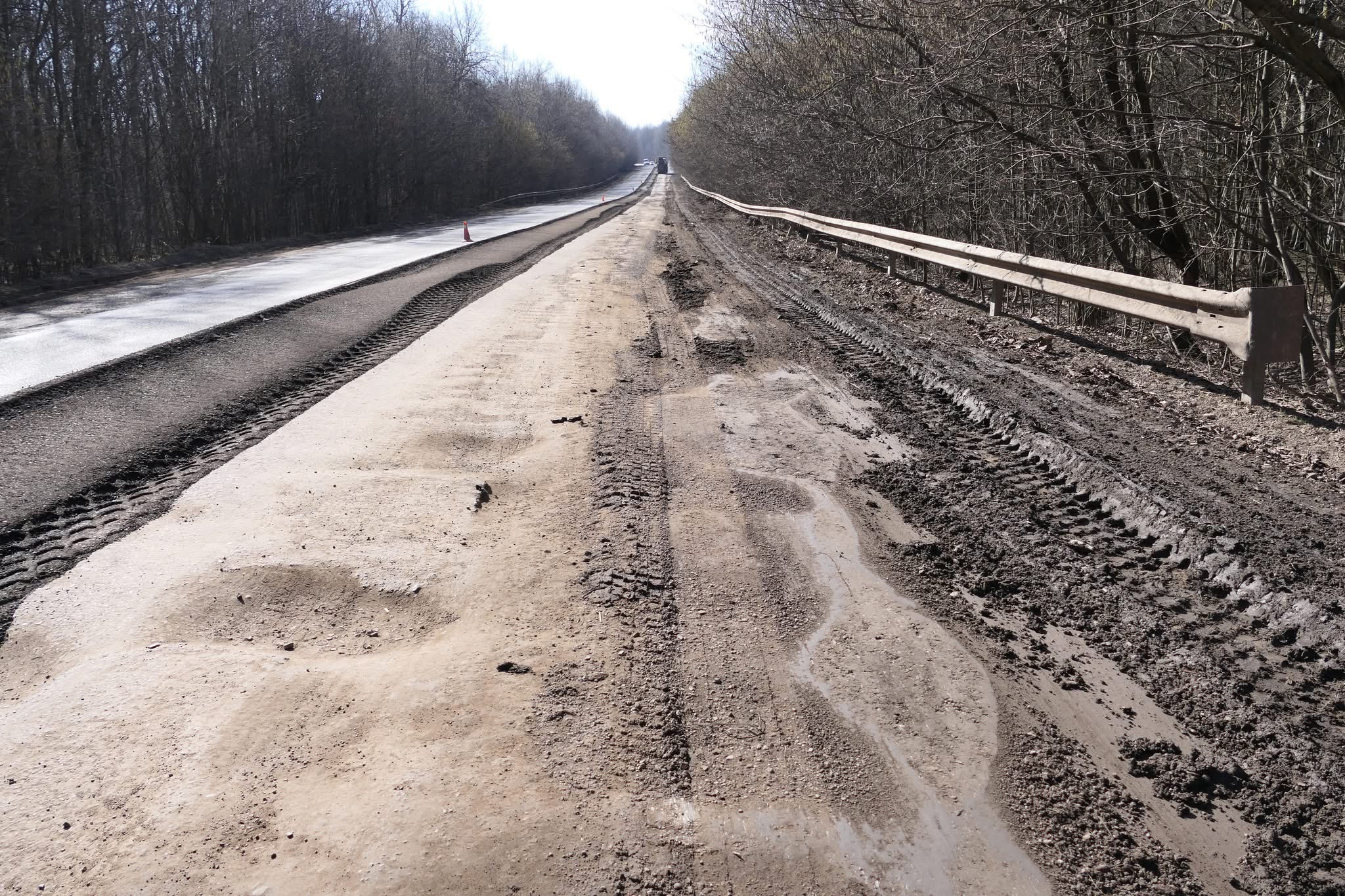Наступний етап – профілювання автогрейдером, зміцнення основи покриття з додаванням цементу та щебенево-піщаної суміші, влаштування асфальтобетону.