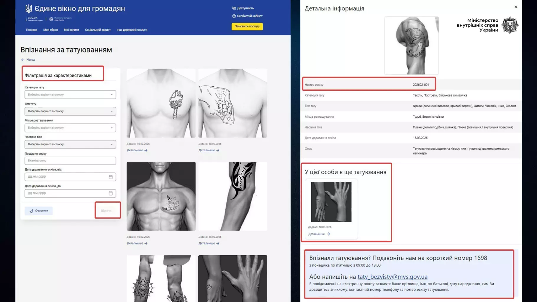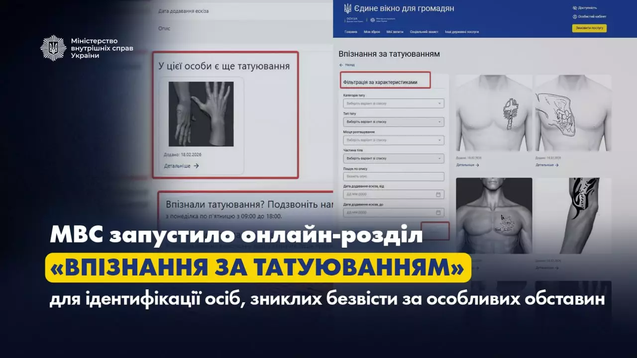 Міністерство внутрішніх справ України запустило новий онлайн-розділ «Впізнання за татуюванням», який має допомогти ідентифікувати осіб, що зникли безвісти за особливих обставин.